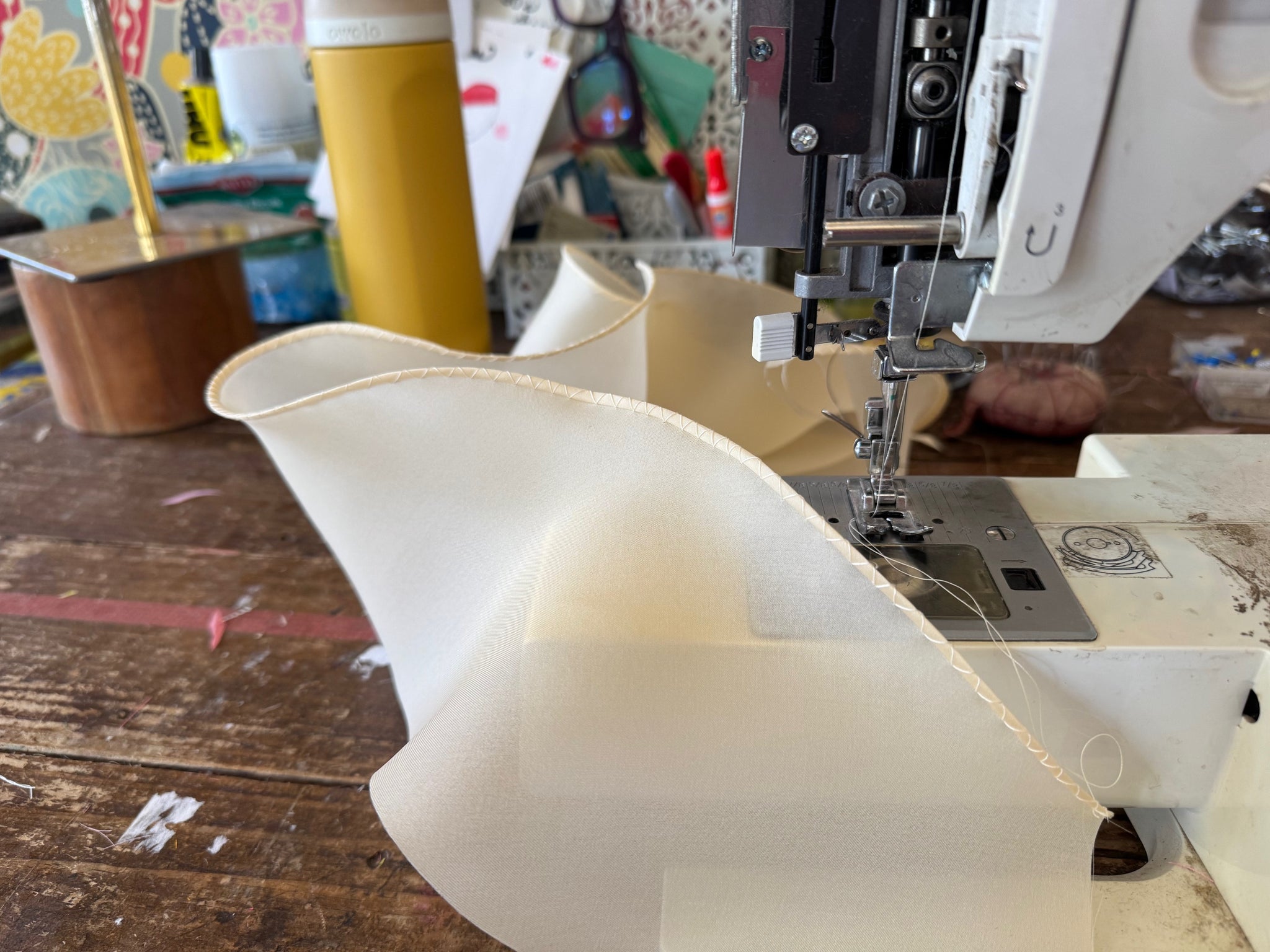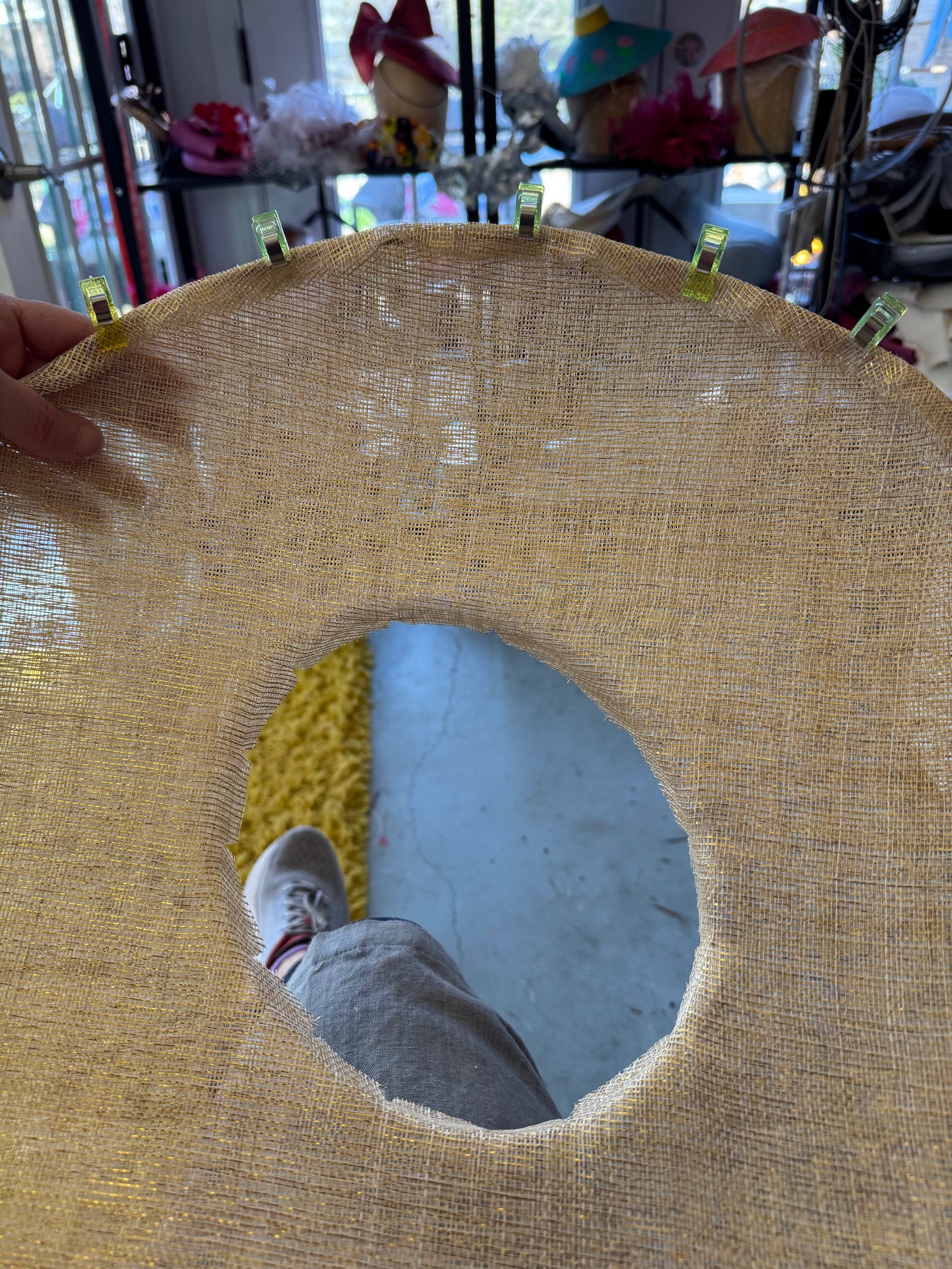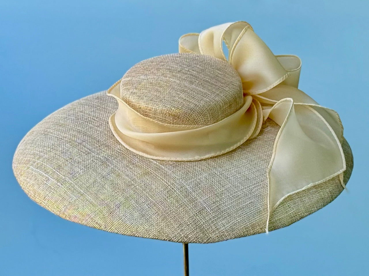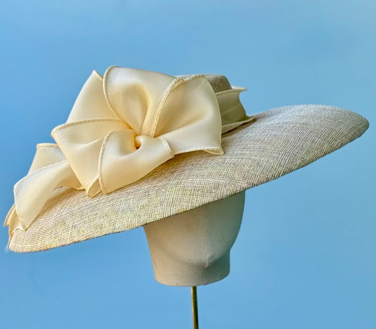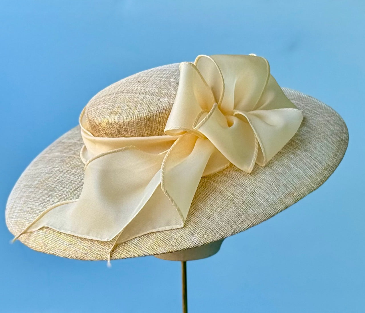 This version is in a sparkly gold straw with a cream silk organza bow. This hat is a great base to work some other colors into to match your outfit.