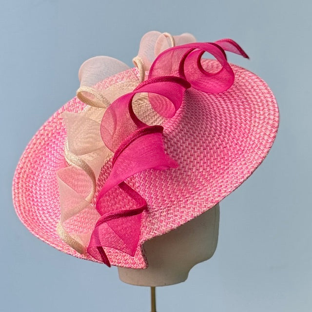 I'm not being coy about the inspiration for this fascinator. This is a flattering, face hugging shape made in buntal straw with a fun herringbone pattern. The straw is in a pin pink and ivory, paired with two horsehair spirals for a fun flair. The alice band that it sits on is made in a flexible wire that can bend closer to the head for a very comfortable fit.