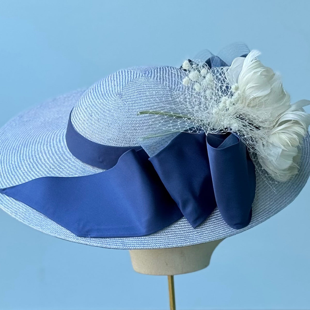 This version is in a custom dyed pale blue straw with a dead stock Marc Jacobs denim taffeta silk bow and hand curled feather flower. She reminds me of a magnolia and was color inspired by a recent trip to Charleston. The headsize is between 22.5-23".