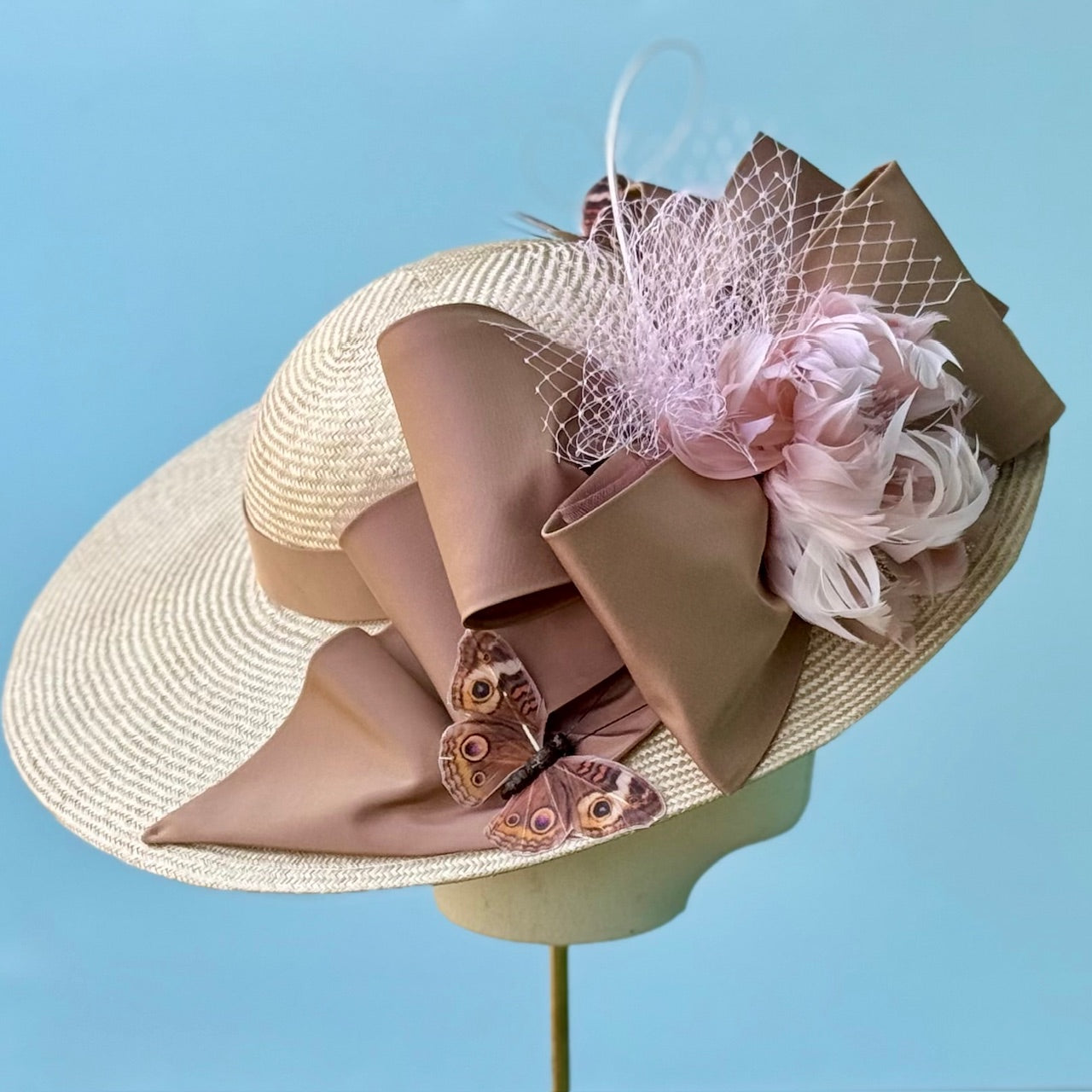 This version is in a custom dyed natural straw with a latte pink taffeta silk bow and matching feather flower. The headsize is between 22.5-23".