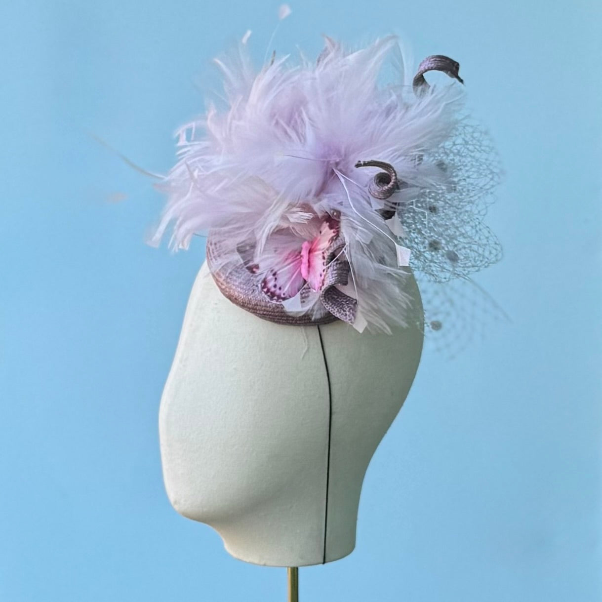 Little Fizz is our go to style for a Derby or Oak's Day fascinator. Little Fizz has a petite, classic button shaped base with feather puff and straw swirls nestled into the back of the hat. You could add a face veil, make the feathers more dramatic, or customize any color. The hat stays on with a discreet elastic that goes under your hair, behind your head. Message me for a custom order. This version has a heather straw base, tonal straw twirls, a lilac feather, and vintage dotted veiling.