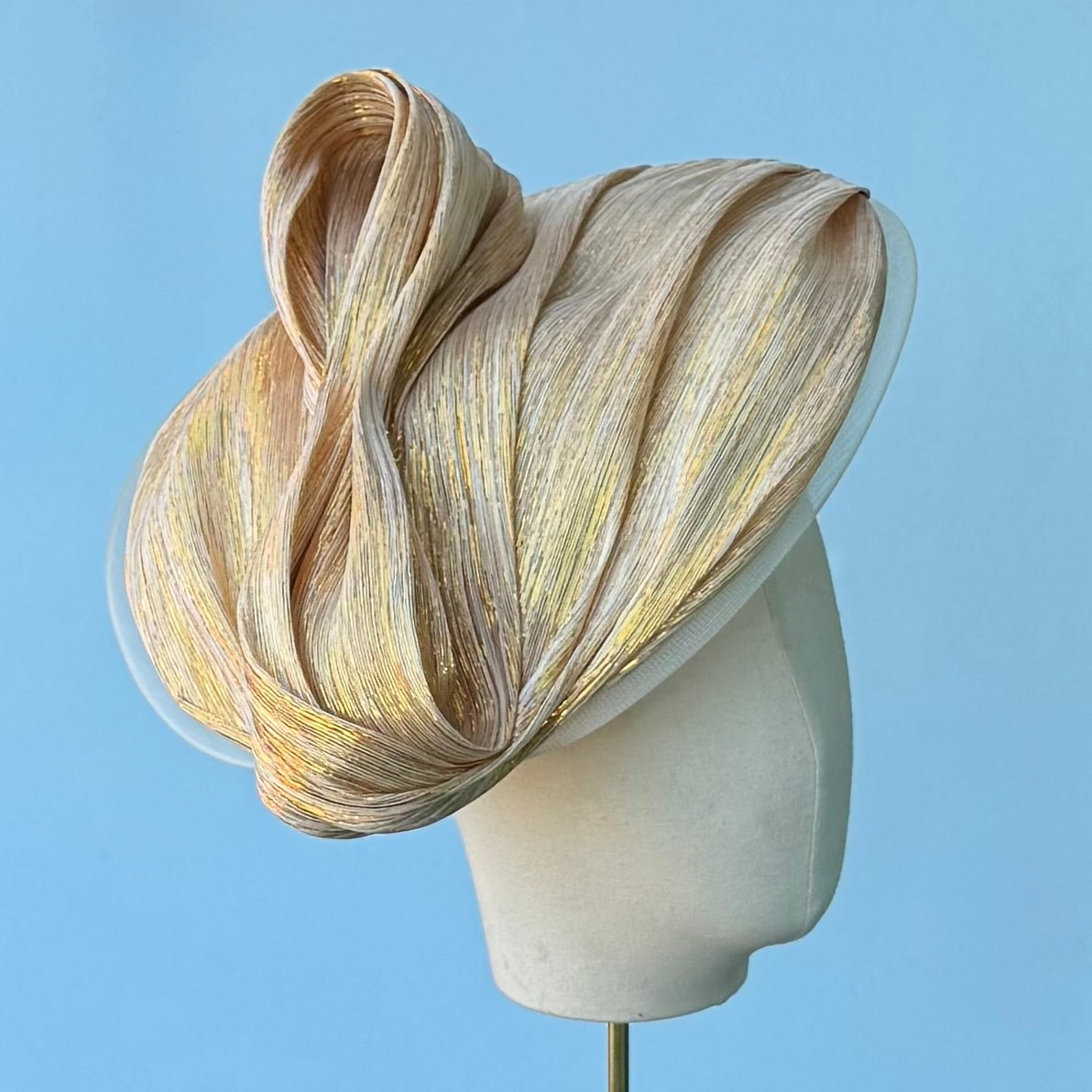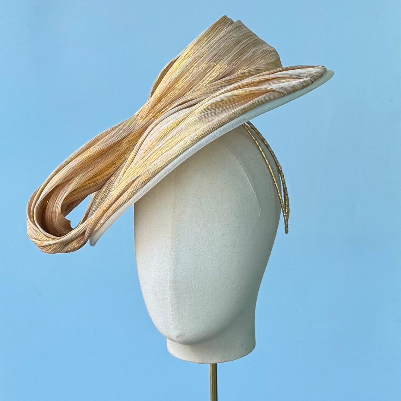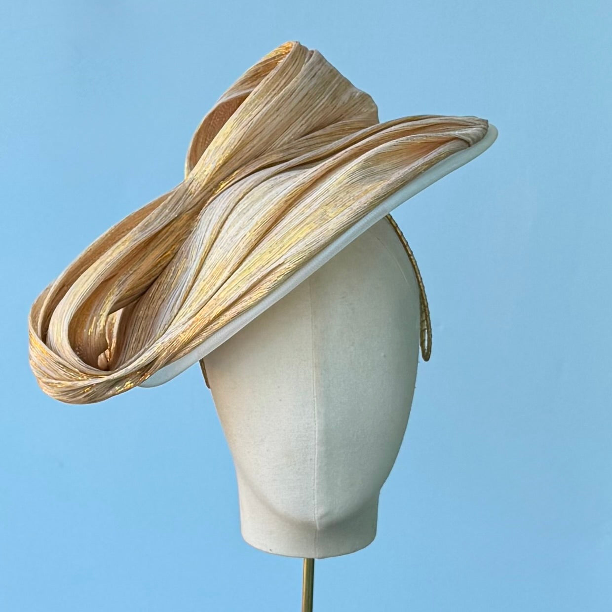 The New Look threads the needle of being both modern and vintage at the same time. The face hugging profile shape is draped in silk abaca straw and finished with a sculptural bow. The piece sits on a wired Alice band making it super comfortable and bendable to your head. I would consider it of medium height and size. I would love to see this with a full skirted outfit and fitted top. Think Dior of the 1950's! This is in a shimmery gold and cream color. If you are unsure what you are wearing, this color is a safe bet to match.