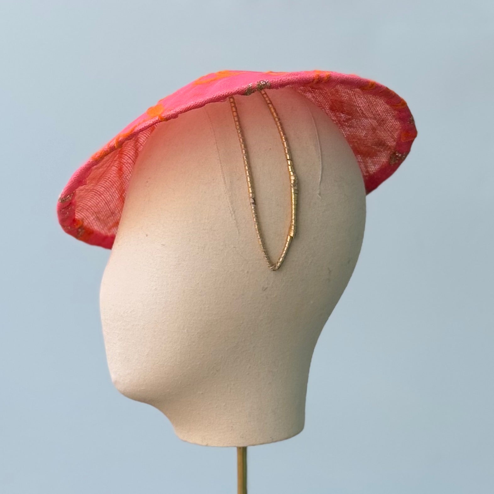 Pictures do not do this hat justice!  Parapluie is a sweet little umbrella shape that is light as air and sits on a leather wrapped, wire frame.  Perching over your right side, she won't get in the way horse viewing and has an easy je ne sais quois that will make you look like an expert hat wearer.
