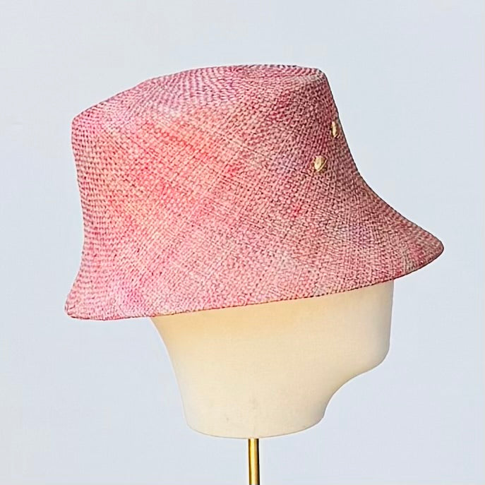 Simple bucket hat in a charming ramie sisal straw with two brass ladybugs for luck. This hat is good for a 22.5"-23.25" headsize.